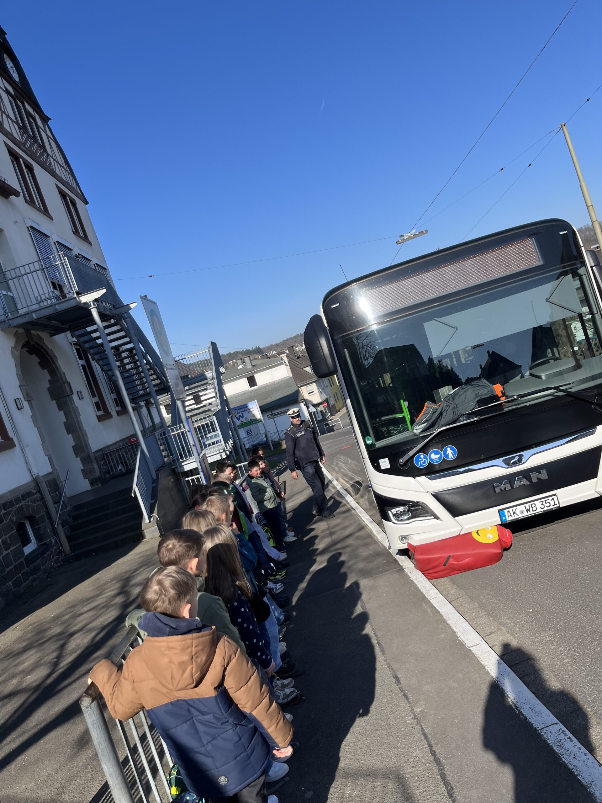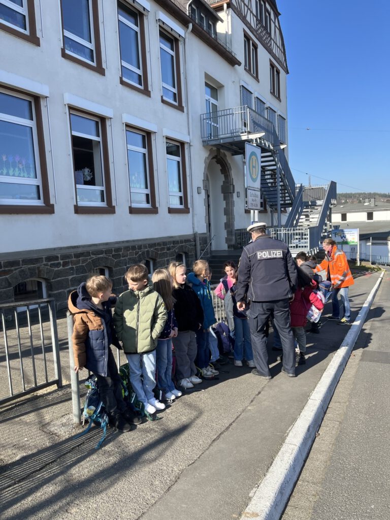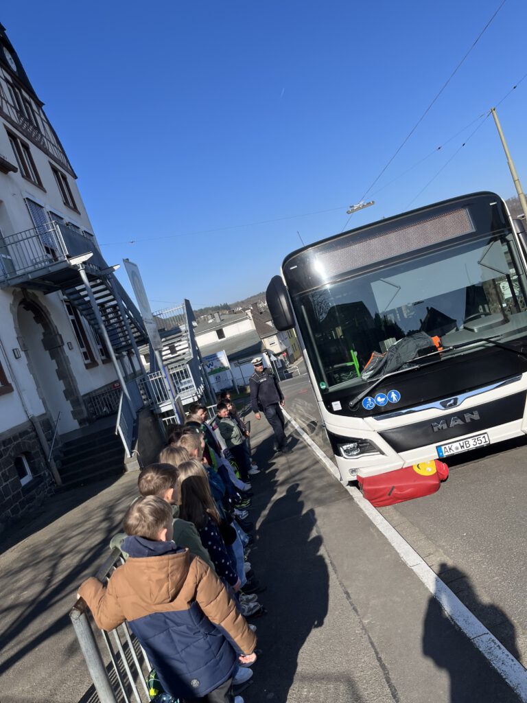 Besonders anschaulich und spannend wurde das Training dadurch, dass extra ein Bus zur Verfügung stand. An unserer schuleigenen Bushaltestelle konnten die Kinder die Situationen gemeinsam mit Herrn Müller ganz praktisch üben. Ein eindrucksvolles Beispiel zeigte, wie gefährlich es sein kann, zu nah am Bordstein zu stehen: Mit einem Dummy wurde demonstriert, dass man in diesem Fall sogar vom Bus erfasst werden kann.